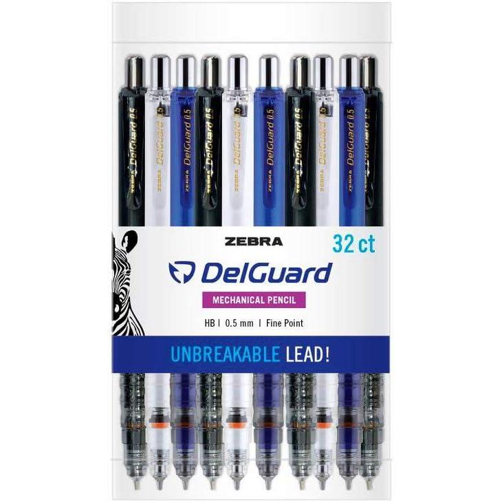 Whether student or professional, Zebra offers a wide selection of mechanical pencils, each thoughtfully designed to meet your needs. If you're looking for balance and consistency of lines, the DelGuard mechanical pencil will not disappoint. DelGuard's double spring, patent-pending mechanism ensures lead is secure and protected from breakage every time you click to advance your lead; for best results we recommend clicking twice! Our patented technology eliminates lead breakage regardless of writing styles and angles, resulting in an enjoyable writing experience uninterrupted by broken lead. The DelGuard Mechanical Pencil features a lightweight, black barrel with a textured grip for enhanced comfort. Provides a precise and enjoyable writing experience. Try it, we dare you! The recommended refills for this mechanical pen are Zebra's DelGuard Unbreakable Lead Refill (89881) and Zebra's DelGuard Eraser Refill (83225).