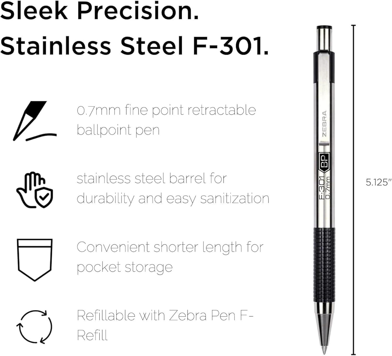 Zebra Pen F-301 Ballpoint Fine Point 0.7mm Stainless Steel Retractable Ballpoint 4-Pack – Easy-Glide Ink, Non-Slip Grip, Metal Clip, Refillable with F-Refill, Professional Design (27174)(Black F)