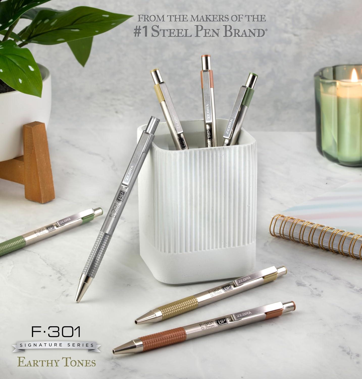 Zebra Pen F-301 Retractable Ballpoint Pen is sleek, sophisticated and easy to sanitize. This hard-working metal pen brings industry-leading precision and stability to your writing. The refillable F-301 has a metal plunge, clip and cone for an executive look. Retractable ballpoint pens have assorted ink and a 0.7mm fine point tip. Corrosion resistant, stainless steel barrel is easier to sanitize than plastic. Shorter barrel slips easily into shirt pockets. Comfort grip matches barrel accents. Metal clip readily attaches to a notebook, planner, work bag or briefcase pocket. This 4-count pack of attractive pens with assorted ink is perfect for home, school or office. Includes 1 each of black, blue, red and green. Clean and stylish, this trusted pen is suitable for boardrooms, courtrooms, classrooms, medical settings, offices and job sites. It’s the right pen for any job.