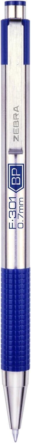 Zebra Pen F-301 Ballpoint Fine Point 0.7mm Stainless Steel Retractable Ballpoint 4-Pack – Easy-Glide Ink, Non-Slip Grip, Metal Clip, Refillable with F-Refill, Professional Design (27174)(Blue)