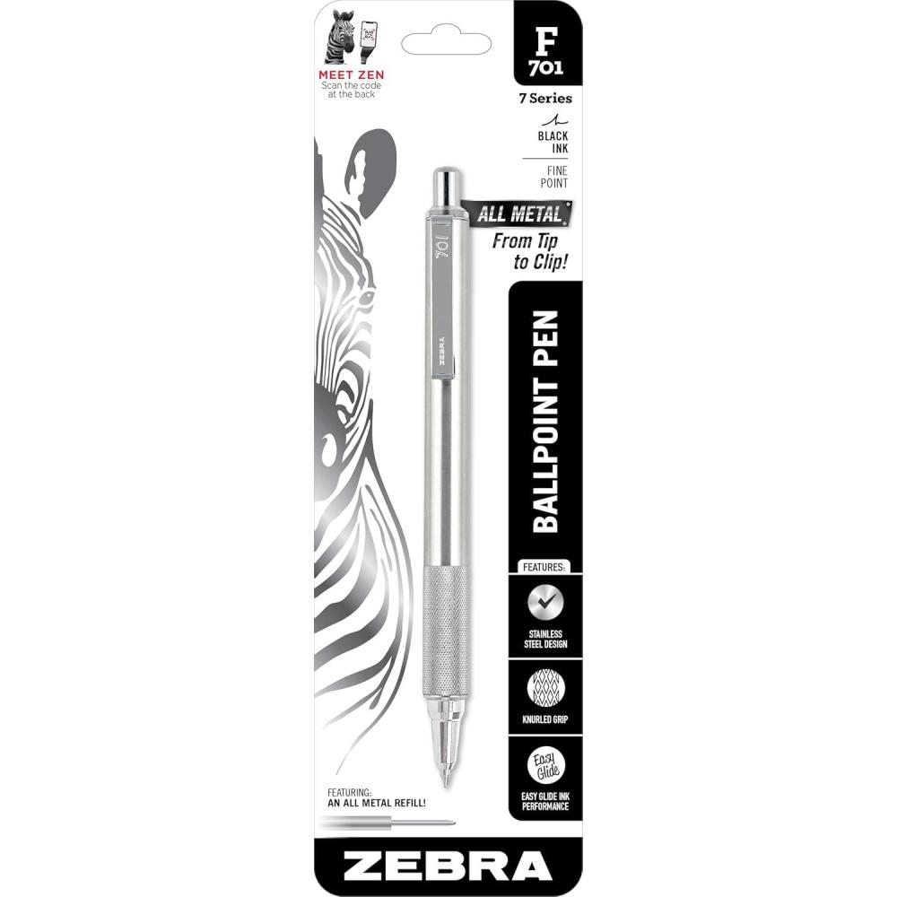 Introducing the Zebra Pen F-701, a sophisticated writing instrument designed for those who demand quality and style in their school supplies, teacher supplies, and office supplies. The Zebra Pen F-701 is more than just a pen; it is a statement of elegance and functionality, ideal for any setting where precision and professionalism are essential. This exquisite pen is available in a convenient 4-Pack, accompanied by 2 additional refills, ensuring you have a reliable writing tool for every occasion. The Zebra Pen F-701 is renowned for its sleek stainless-steel barrel, which not only provides a modern aesthetic but also ensures durability and longevity. The knurled grip offers enhanced control and comfort, making it an ideal choice for extended writing sessions. The stainless steel barrel and clip add to the pen's robustness, ensuring it can withstand the rigors of daily use. Equipped with a fine point, 0.8mm black ballpoint, the Zebra Pen F-701 delivers a smooth and consistent writing experience. The black ink pens are perfect for any writing task, whether for professional documents, personal notes, or creative endeavors. The silent retractable plunger mechanism further enhances the pen's usability, allowing for seamless operation without disturbing your surroundings. The Zebra Pen F-701 is a quintessential choice for those seeking pens for writing that combine style with substance. Its retractable ballpoint pen design makes it a practical addition to your collection of pens for work or school. As a metal pen, it exudes a sense of sophistication and reliability, making it a favored choice among black pen enthusiasts. Whether you're in search of a nice pen for personal use or a reliable pen for your professional toolkit, the Zebra Pen F-701 stands out as a premier option. Make the Zebra Pen F-701 a staple in your office supplies and experience the difference of writing with a pen crafted to meet the highest standards of quality and performance. This black pen is not just a writing instrument; it's a testament to the art of fine craftsmanship in pens for work and beyond. Choose the Zebra Pen F-701 – where form meets function in perfect harmony.