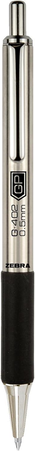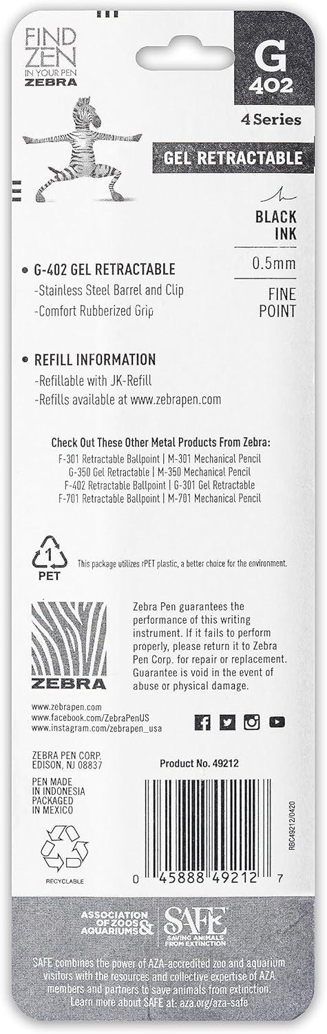 Zebra Pen G-402 Retractable Gel Pen is attractive, sleek, and easy to sanitize. This elevated metal pen combines the simplicity of a stainless steel barrel with a weighted experience for enhanced writing comfort. With its vibrant black color, the 0.5mm fine point is perfect for everyday writing, document signatures and creative expression. This gel ink pen has a sleek stainless steel barrel, comfortable rubberized grip, and convenient pocket clip. Corrosion resistant, stainless steel barrel is easier to sanitize than plastic. Metal clip readily attaches to a notebook, planner, work bag or briefcase pocket. Impress your pen pal, up your bullet journal game or fill out your daily diary with a trusted, continually reliable writing experience with this 2-count pack of gel pens. Enjoy the precision of a gel ink pen in your home and office writing without any of the drawbacks. Clean and stylish, this trusted pen is suitable for boardrooms, courtrooms, classrooms, medical settings, offices and job sites.