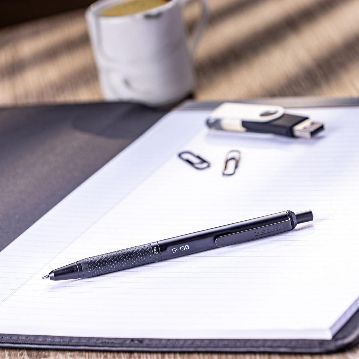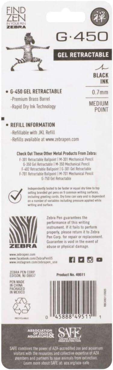 Zebra Pen G-450 Retractable Gel Pen gives you the smoothness of a gel ink pen without the worries of smudges and smears. Rapid Dry Ink (RDI) Technology has been tested by a third party lab to have equal or faster dry time to industry leaders on nine common writing surfaces, making it the ultimate quick dry pen for the left handed. With its vibrant color, the 0.7mm medium point is perfect for everyday writing, document signatures and creative expression. This black ink pen has a sleek black weighted brass barrel, comfortable rubber grip, and convenient pocket clip. Impress your pen pal, up your bullet journal game or fill out your daily diary with a trusted, continually reliable writing experience with this attractive pen. Enjoy the precision of a gel ink pen in your home and office writing without any of the drawbacks. Refillable with Zebra’s JK Refill in black (88112).