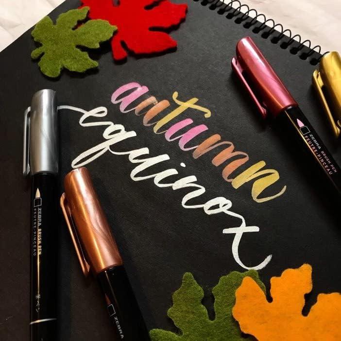 Add some flair to your lettering or crafts with the Zebra Metallic Brush Pens! These metallic ink brush pens feature shimmering pigment ink that is acid free, archival quality, and water-resistant for a long-lasting impression. The shiny metallic ink maintains its vibrancy on dark paper and delivers vivid lines that stand out! The versatile flexible brush point mimics an artist's paint brush and enables you to achieve thin and thick strokes while lettering for beautiful, striking end results. Housed in a black, sturdy barrel with a convenient pocket clip, these colorful art brush pens are equally stylish and durable. Whether you're looking to add a pop of color to your headlines or create traditional lettering, illustrations and manga, Zebra's Metallic Brush Pens help you express your creativity in a unique way.