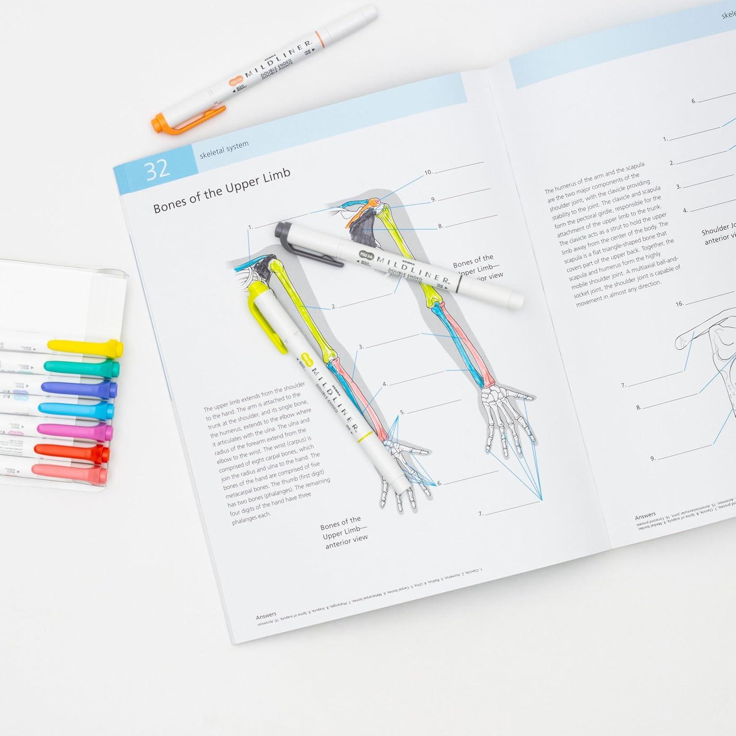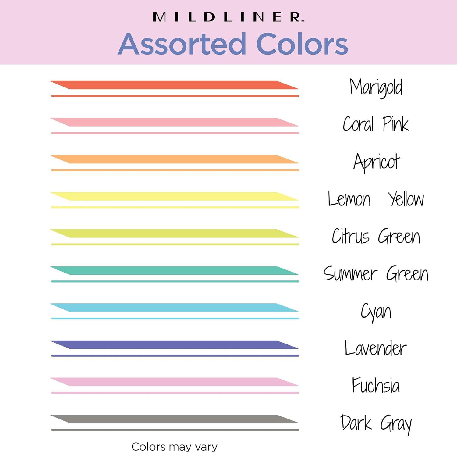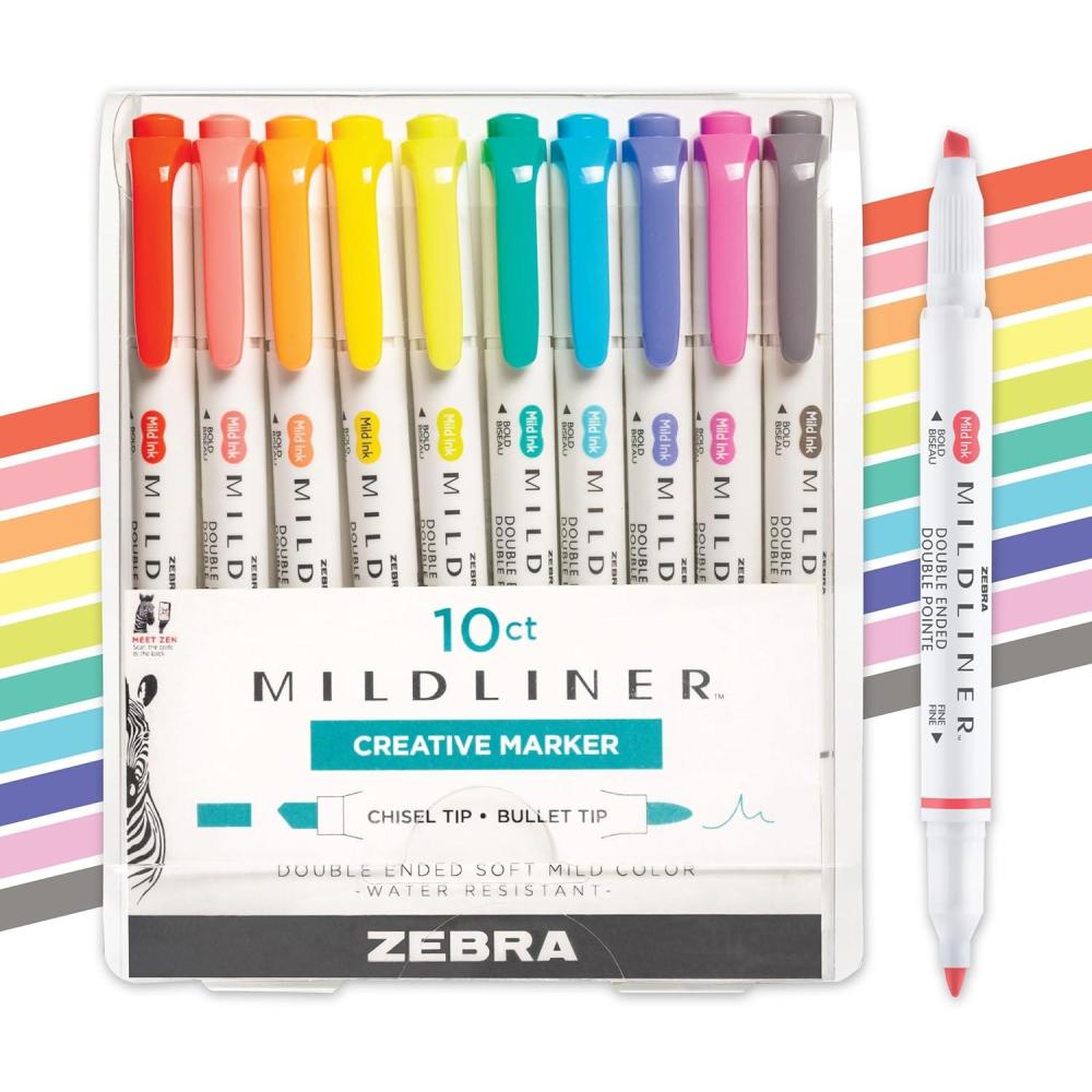 Zebra Pen Mildliner Dual-Tip Highlighter pens help you express your unique creativity with the convenience of two sized tips in each pen. Each pen’s unique mild color provides soft hue on the page, allowing you to layer with the water resistant ink with ease. Beautiful pastel colors don't bleed through so you needn't worry about the next page in your sketchbook. This 5-count set of dual tip aesthetic markers includes cool and refined tones: mild green, mild dark blue, mild gray, mild violet, and mild red. AP certified non-toxic. Keep a set of Mildliner Double Ended Highlighters in your desk drawer, art bin or backpack for creativity at your fingertips. Create personalized greeting cards, sketch out a new idea or add dashes of precision color to any project. Add some beauty to your bullet journal, Bible study or planner. Bring a touch of color to handmade cards, letters and art presentations. Gift your favorite budding artist with a complete set. Excellent for marking up important passages in texts. Complete your creative kit with additional Zebra Pen artists’ instruments like Sarasa Fineliners, Zensations Technical and Calligraphy pens.