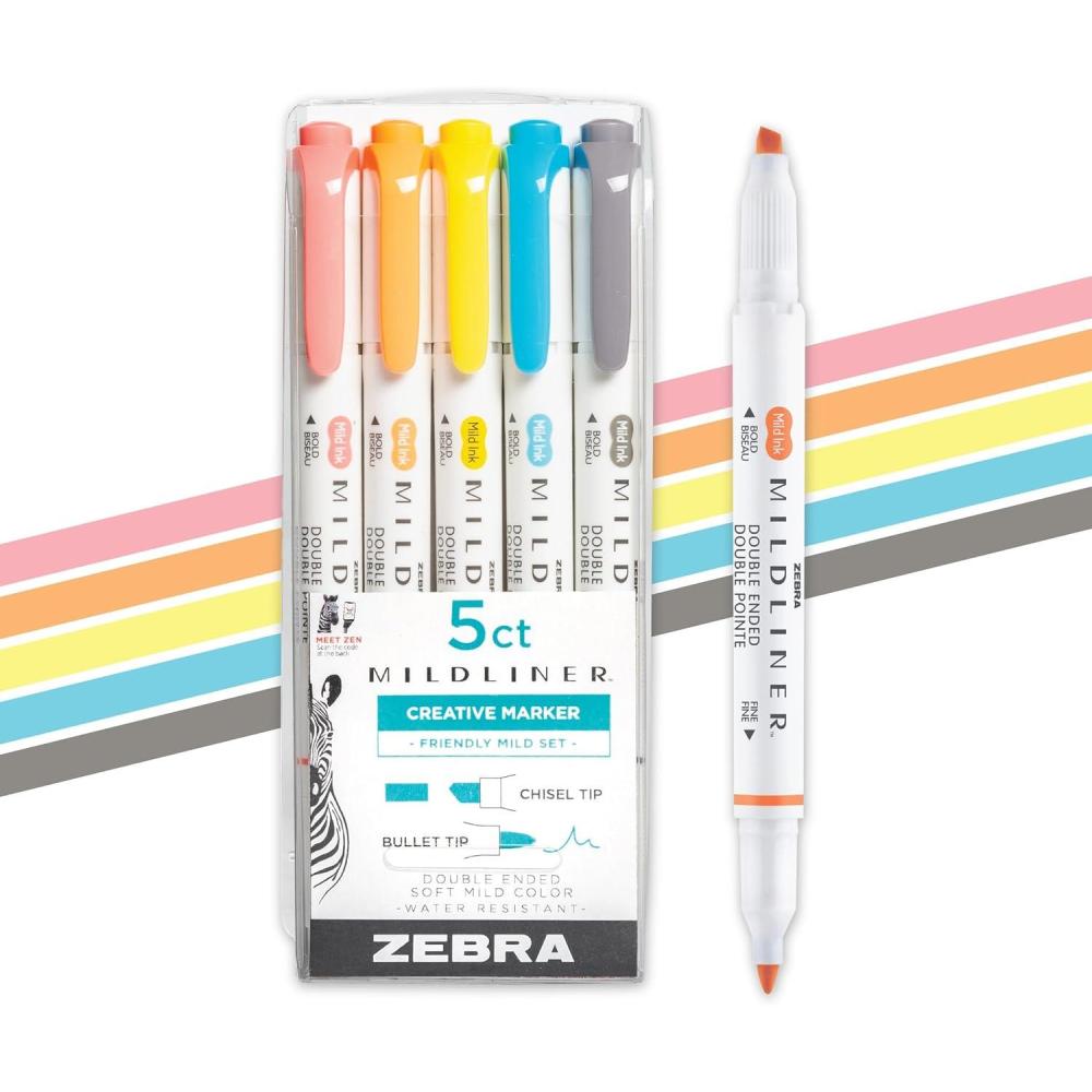 Zebra Pen Mildliner Dual-Tip Highlighter pens help you express your unique creativity with the convenience of two sized tips in each pen. Each pen’s unique mild color provides soft hue on the page, allowing you to layer with the water resistant ink with ease. Beautiful pastel colors don't bleed through so you needn't worry about the next page in your sketchbook. This 5-count set of dual tip aesthetic markers includes cool and refined tones: mild green, mild dark blue, mild gray, mild violet, and mild red. AP certified non-toxic. Keep a set of Mildliner Double Ended Highlighters in your desk drawer, art bin or backpack for creativity at your fingertips. Create personalized greeting cards, sketch out a new idea or add dashes of precision color to any project. Add some beauty to your bullet journal, Bible study or planner. Bring a touch of color to handmade cards, letters and art presentations. Gift your favorite budding artist with a complete set. Excellent for marking up important passages in texts. Complete your creative kit with additional Zebra Pen artists’ instruments like Sarasa Fineliners, Zensations Technical and Calligraphy pens.
