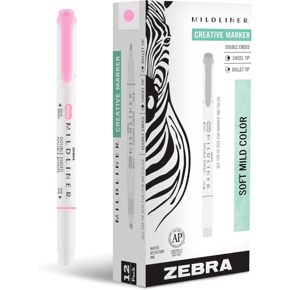 Zebra Pen Mildliner Dual-Tip Highlighter pens help you express your unique creativity with the convenience of two-sized tips in each pen. Each pen’s unique mild color provides a soft hue on the page, allowing you to layer with the water-resistant ink with ease. Beautiful pastel colors don't bleed through, so you needn't worry about the next page in your sketchbook. Includes 12 dual-tip mild violet ink highlighters. AP certified non-toxic. Keep a set of Mildliner Dual-Tip Highlighters in your school supplies, teacher supplies, or office supplies stash for creativity at your fingertips. Create personalized greeting cards, sketch out a new idea, or add dashes of precision color to any project. Add some beauty to your bullet journal, Bible study, or planner. Bring a touch of color to handmade cards, letters, and art presentations. Gift your favorite budding artist with a complete set. Excellent for marking up important passages in texts. Available in additional colors. Complete your creative kit with additional Zebra Pen artists’ instruments like Sarasa Fineliners, Zensations Technical and Calligraphy pens.