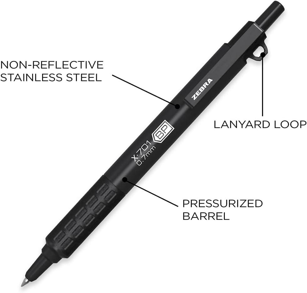X-701 Retractable Ballpoint Pen Writes in extreme conditions from negative 30 degrees Fahrenheit to 250 degrees Fahrenheit for dependable writing no matter where your next adventure takes you. It also provides the stainless steel durable barrel you love with a weighted experience for enhanced writing comfort. Barrel is also nonreflective so it doesn't cause glare. The matte black finish has been updated from previous versions to ensure the finish does not chip. The 0.7 mm fine point promotes precision writing. Sturdy plastic lanyard loop near pocket clip offers another easy way to carry it. The Zebra X-701 ballpoint pen is refillable and includes two refills.