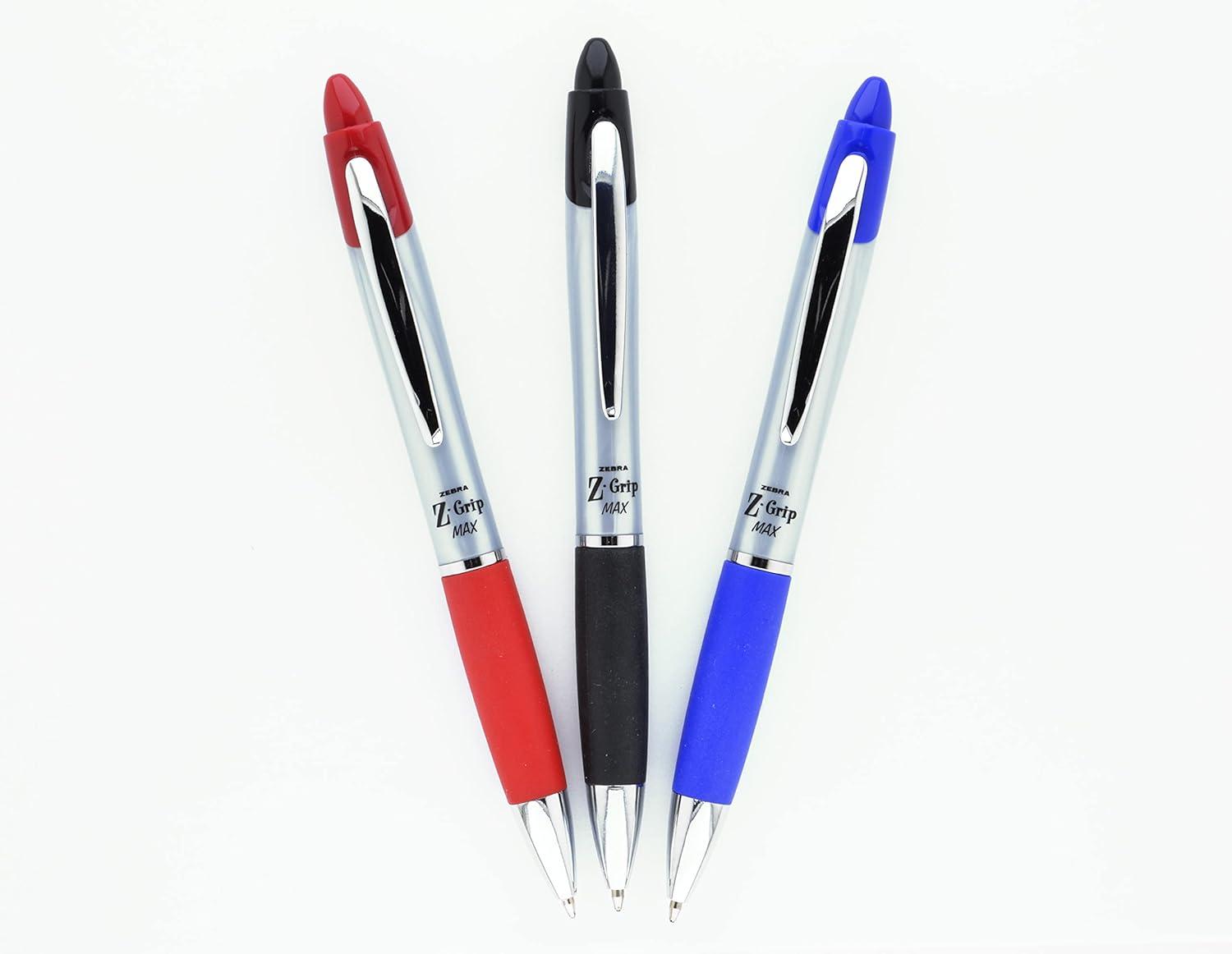 Go with the flow with Zebra Z-Grip MAX retractable ballpoint pens. Bold yet sleek, this retractable ballpoint pen features a wide comfort barrel with colored grip and colored push button to identify ink color at a glance. The convenient metal clip will allow you to add it to any notebook, journal, planner or pocket for easy transportation. Dare to be different and maximize your writing experience with the Z-Grip MAX retractable ballpoint pen from Zebra. Available in a medium 1.0mm tip and 3 easy-glide ink business colors; black, blue and red.