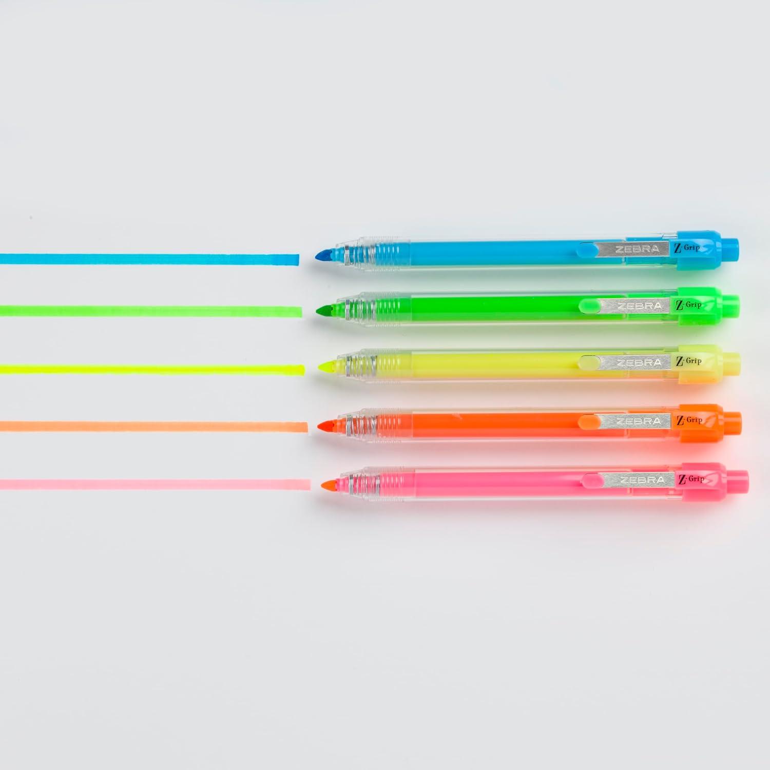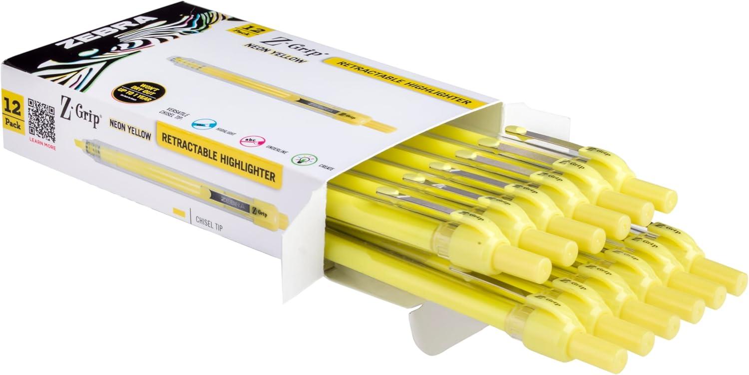 Zebra Pen Z-Grip Retractable Highlighter pens help you to easily make organizing fun! With vibrant neon yellow color, each pen’s unique neon yellow color provides the pop of color your project needs. Includes 12 chisel tip neon yellow color. AP-certified non-toxic. Keep a set of Z-Grip Highlighters in your desk drawer, art bin or backpack. Whether you are marking up office documents or making study notes, the chisel tip is perfect for marking what needs to be seen. Add some beauty to your bullet journal or planner or bring a touch of color to handmade cards, letters and art presentations. Excellent for marking up important passages in texts. Available in additional colors. Highlight, underline and create without the worry of drying out for up to 1 year!