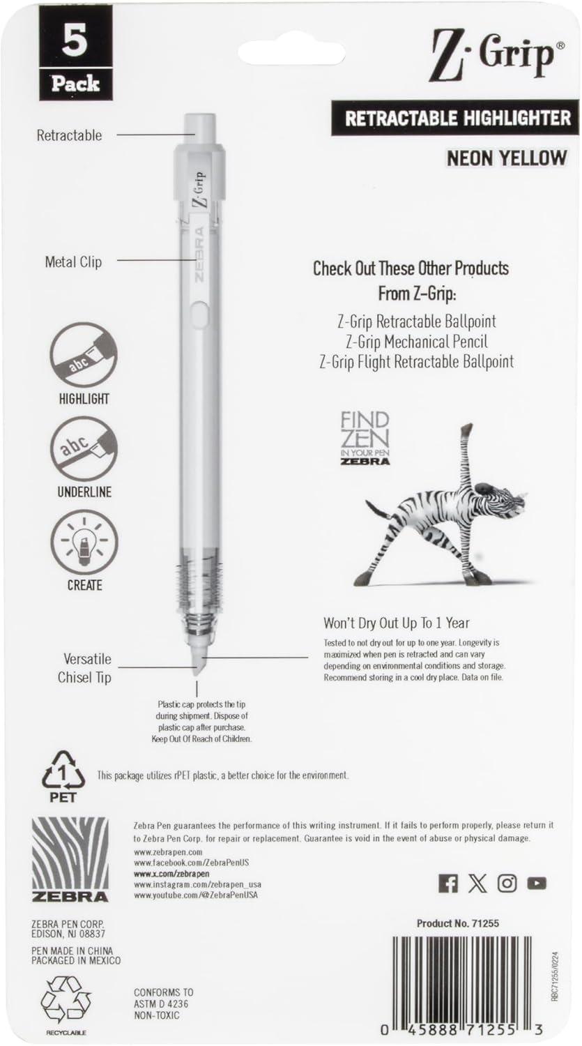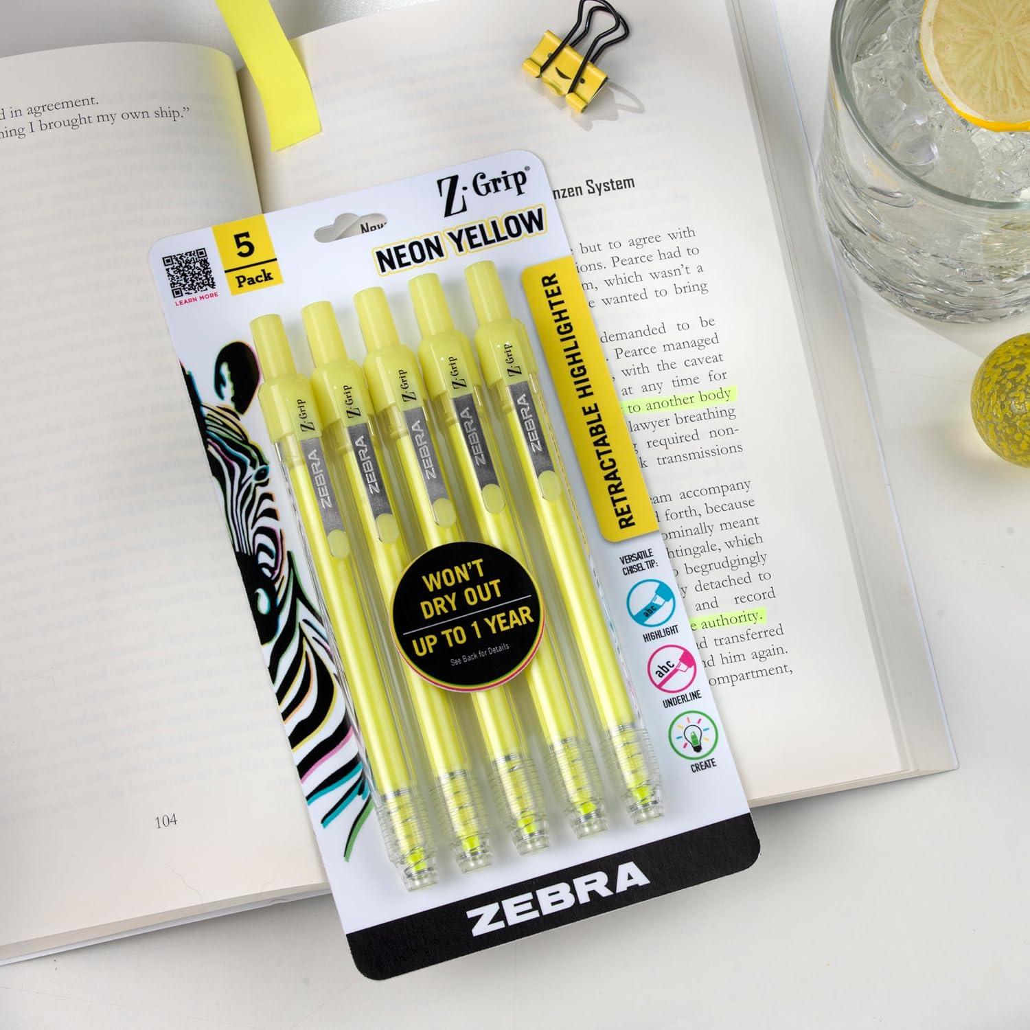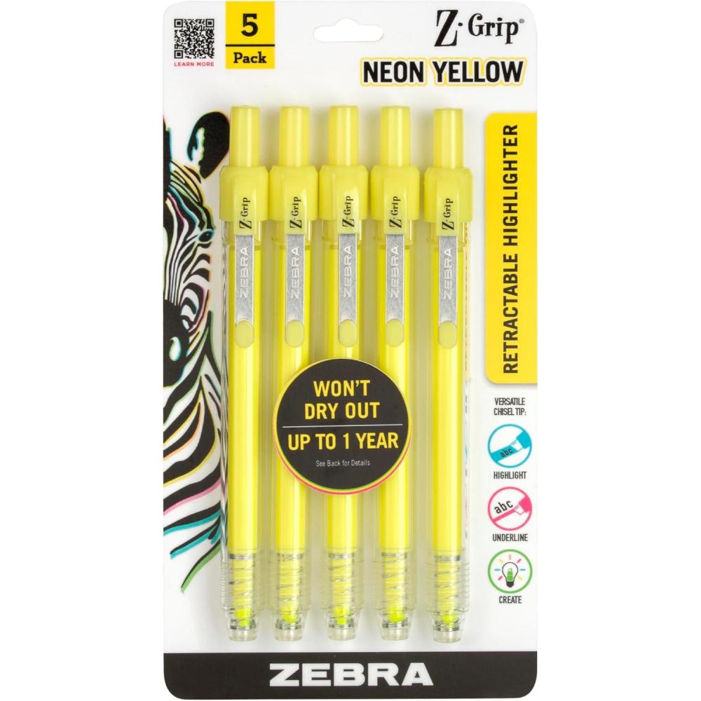 Zebra Pen Z-Grip Retractable Highlighter pens help you to easily make organizing fun! With vibrant neon yellow color, each pen’s unique neon yellow color provides the pop of color your project needs. Includes 5 chisel tip neon yellow color. AP-certified non-toxic. Keep a set of Z-Grip Highlighters in your desk drawer, art bin or backpack. Whether you are marking up office documents or making study notes, the chisel tip is perfect for marking what needs to be seen. Add some beauty to your bullet journal or planner or bring a touch of color to handmade cards, letters and art presentations. Excellent for marking up important passages in texts. Available in additional colors. Highlight, underline and create without the worry of drying out for up to 1 year!